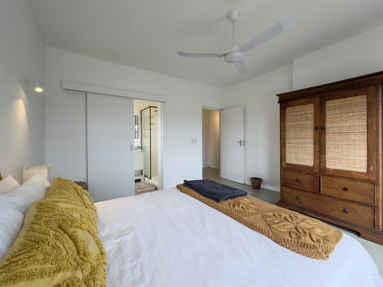 1 x bedroom with Queen size bed, ceiling fan, doors open to the deck, en-suite shower, toilet, and basin.