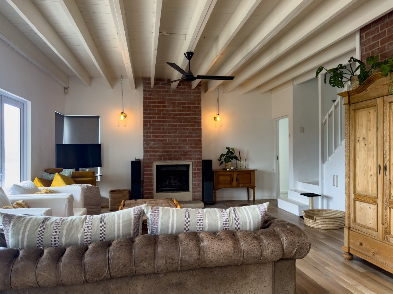 Open plan lounge with comfy sofas, fireplace, ceiling fan, Smart TV, Disney channel, guests can stream their own DSTV.