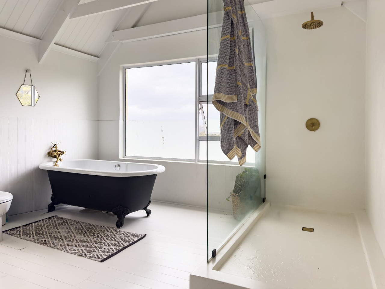 Queen extra length, size bed, spacious en-suite bathroom with bath, shower, toilet, and basin.
