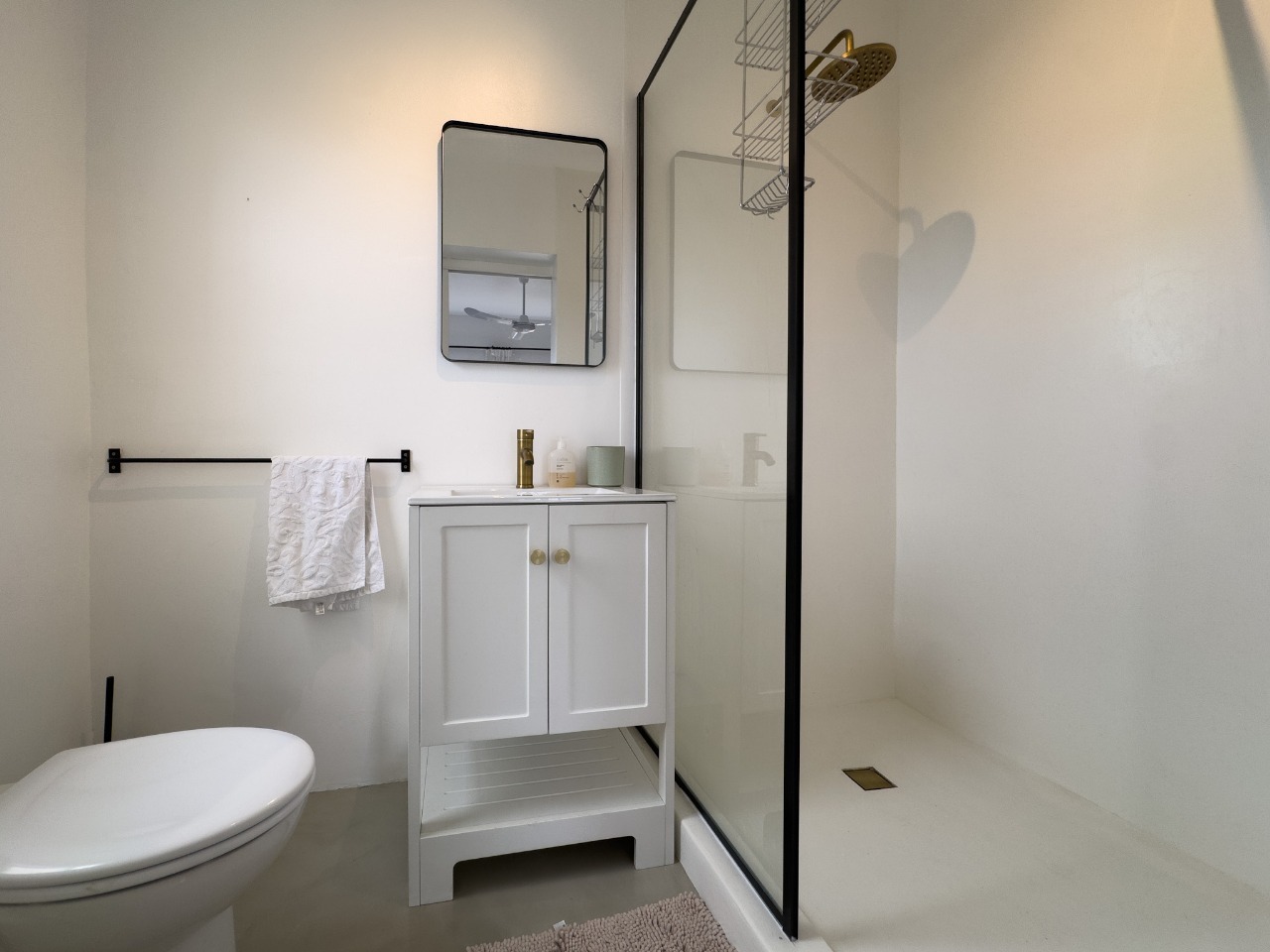1 x bedroom with a double bed, ceiling fan, en-suite shower, toilet, and basin.
